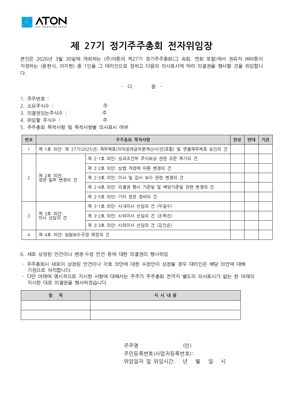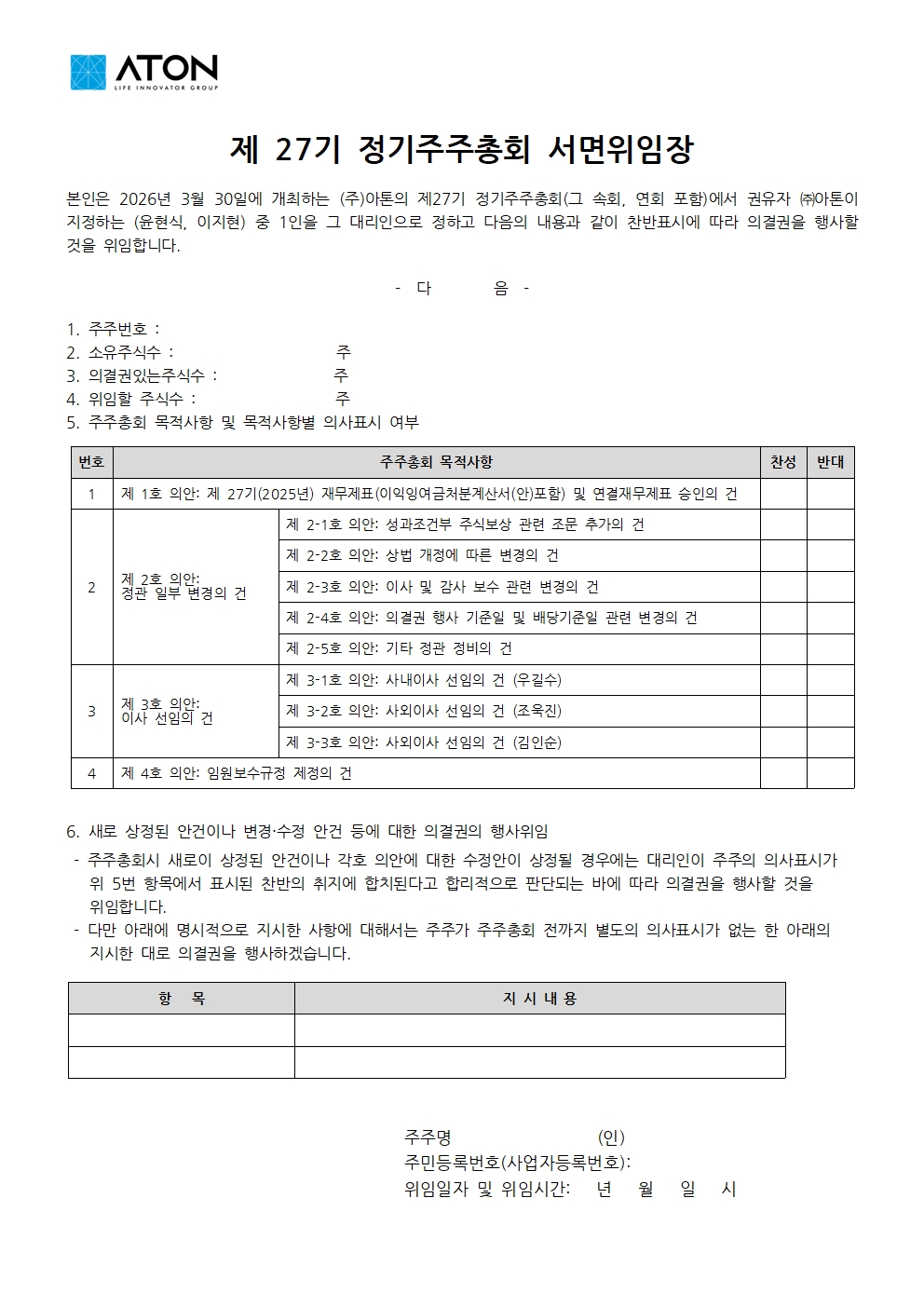 자세한 사항은 2026년 3월 17일 공시된 「의결권대리행사권유참고서류」를 참고해 주시기 바랍니다. 해당 공시의 첨부서류인 「위임장」에서 위임장 양식을 PDF로 다운로드하실 수 있습니다.