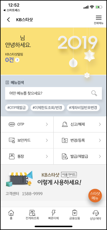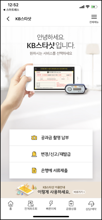 모바일 뱅킹앱 ‘KB스타뱅킹’에서 카메라 촬영만으로 공과금 납부가 가능하며, 고객이 영업점 방문없이 ‘KB스타샷’에서 통장, OTP, 증명서 등의 중요증서를 모바일로 신청한 뒤, 우체국의 본인지정 등기우편을 이용해 받을 수 있는 서비스입니다.